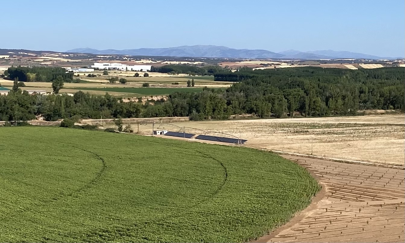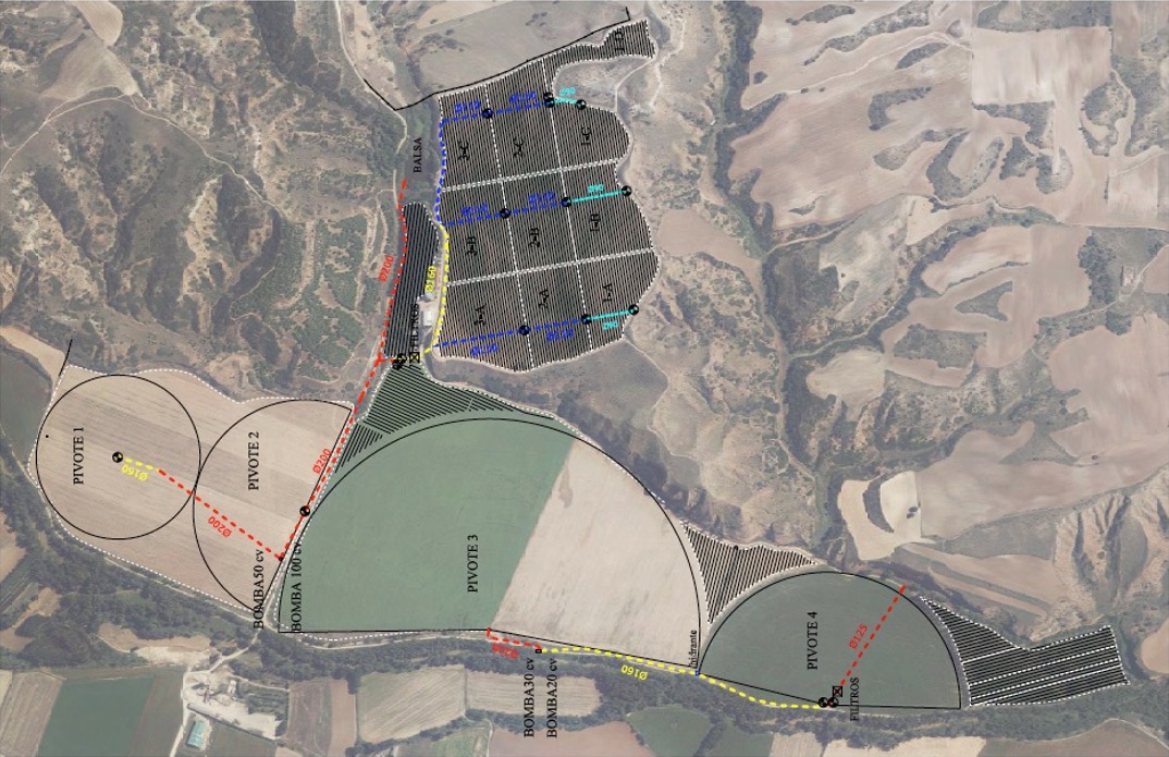 Contamos con 60ha de regadío por aspersion (pivots) dedicadas a la rotación de cultivos como Cebada, Trigo, Maíz, Girasol, Alfalfa, Colza...