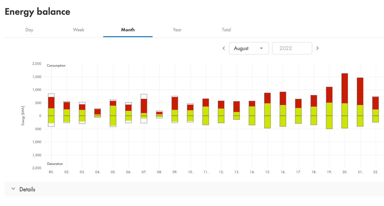 En verde se observa la demanda cubierta con energía generada por las placas, mientras que en rojo se ve la compra de electricidad.