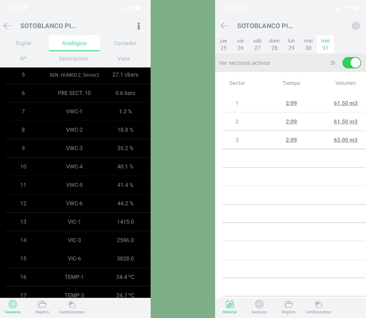 Gestiona además los sensores de humedad, temparratura y conductividad, permitiendo condicionantes avanzados en los procesos de riego..